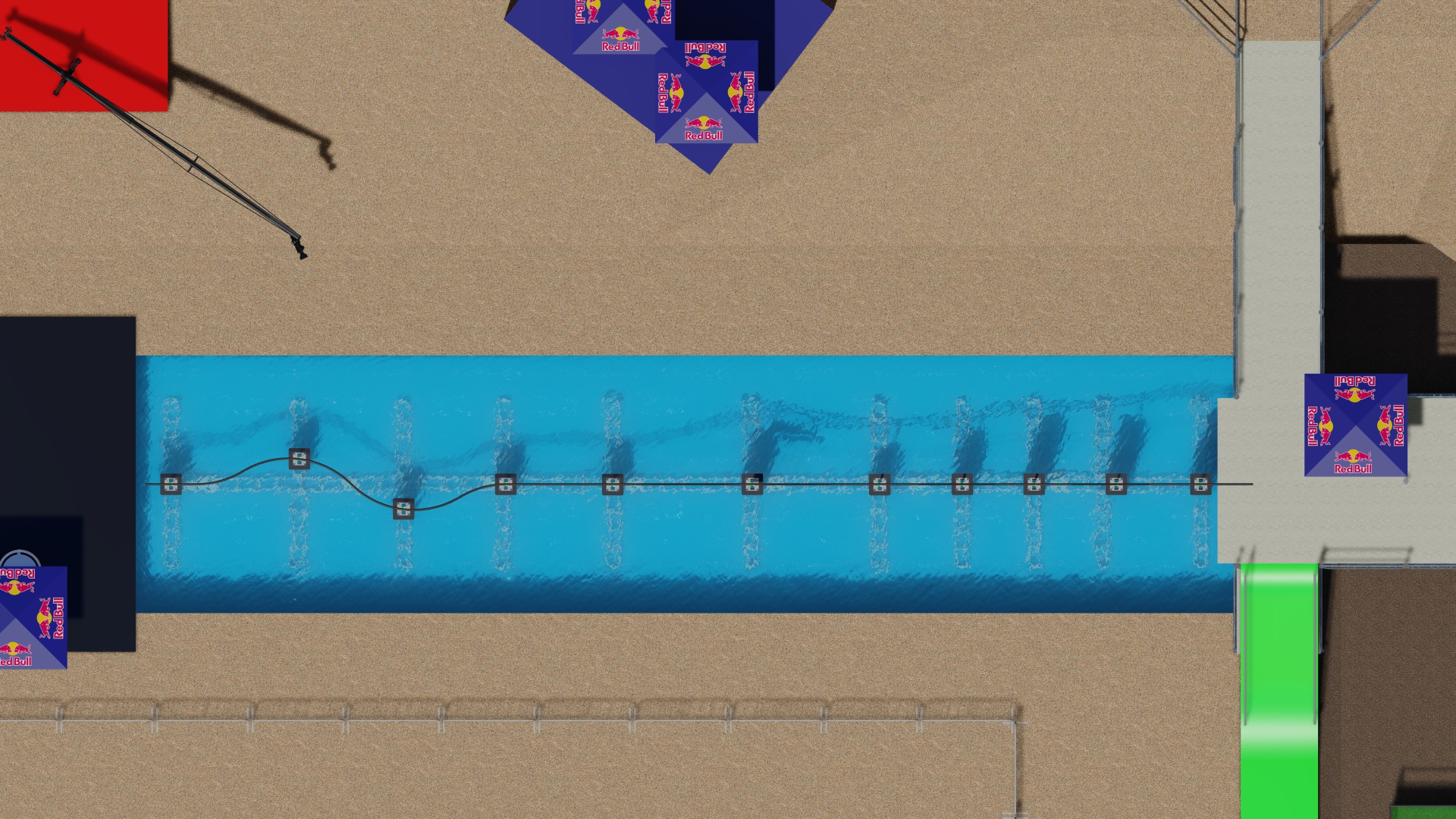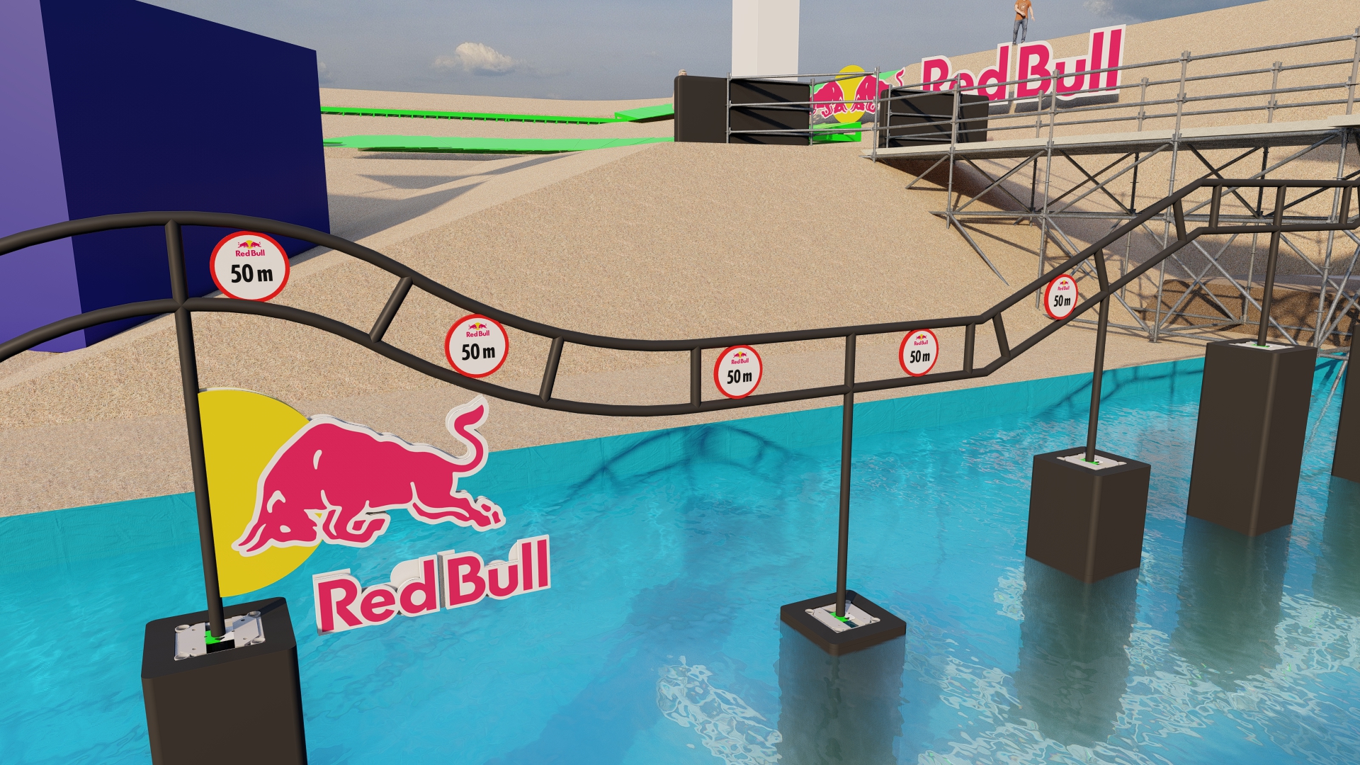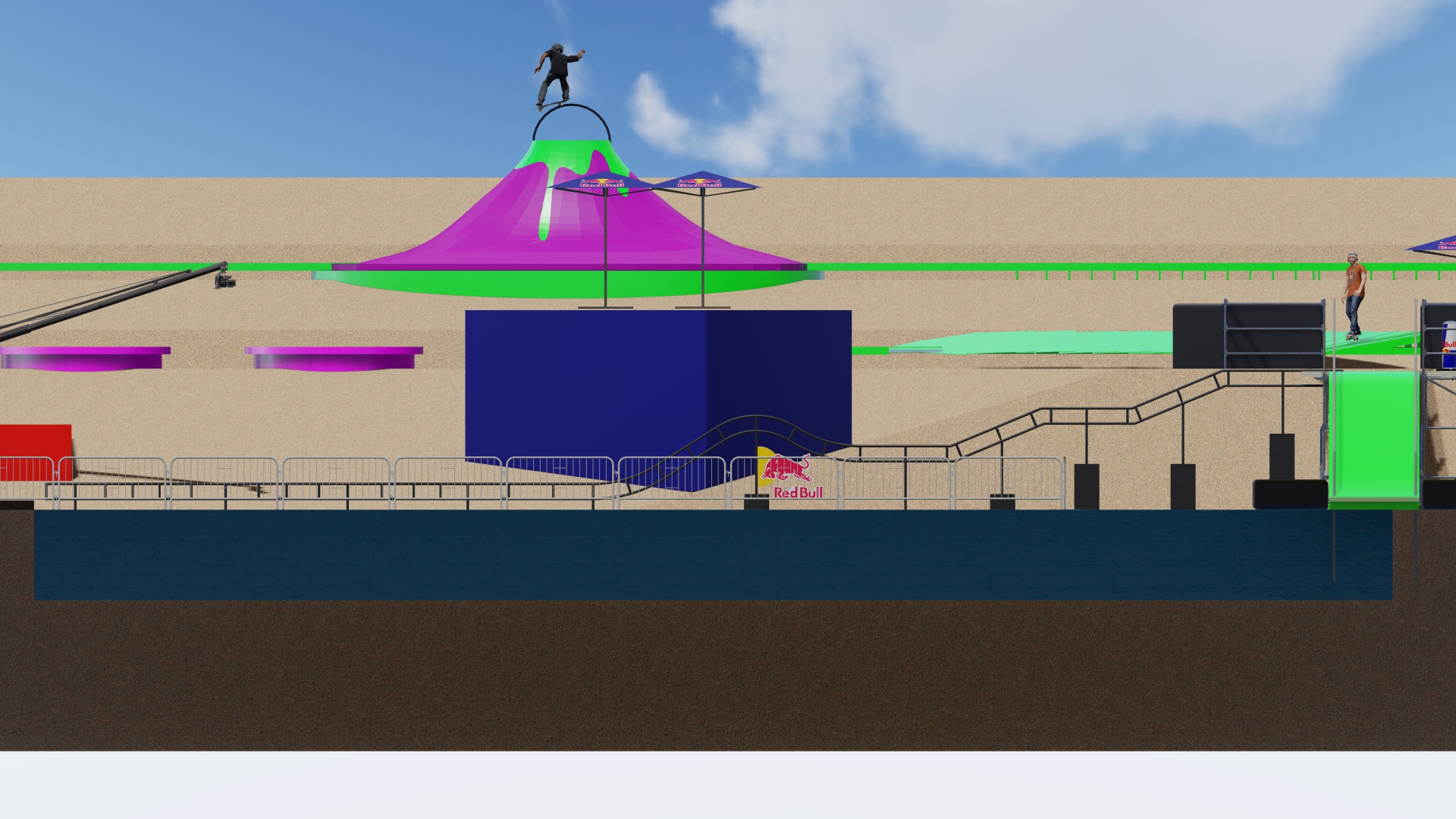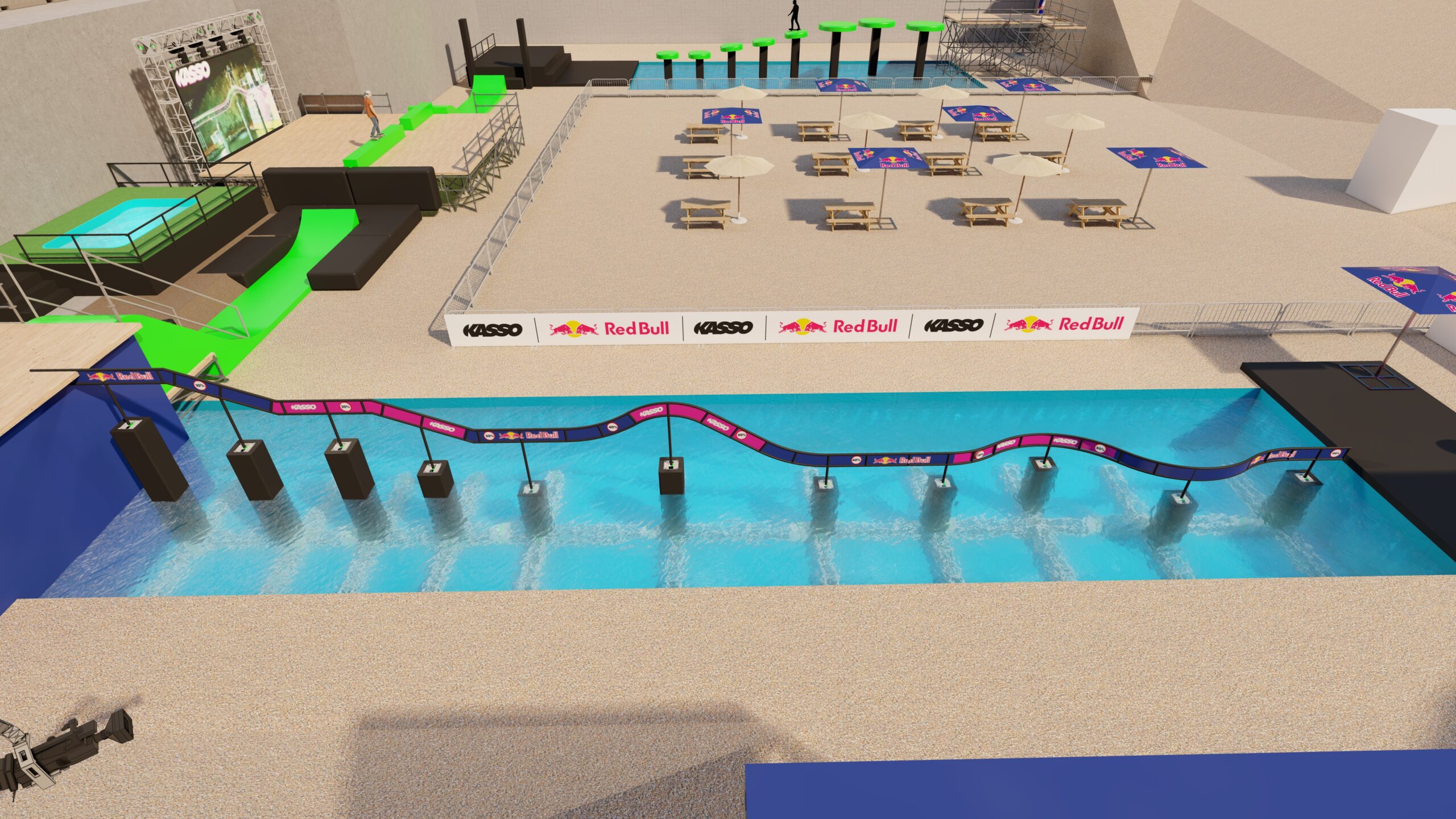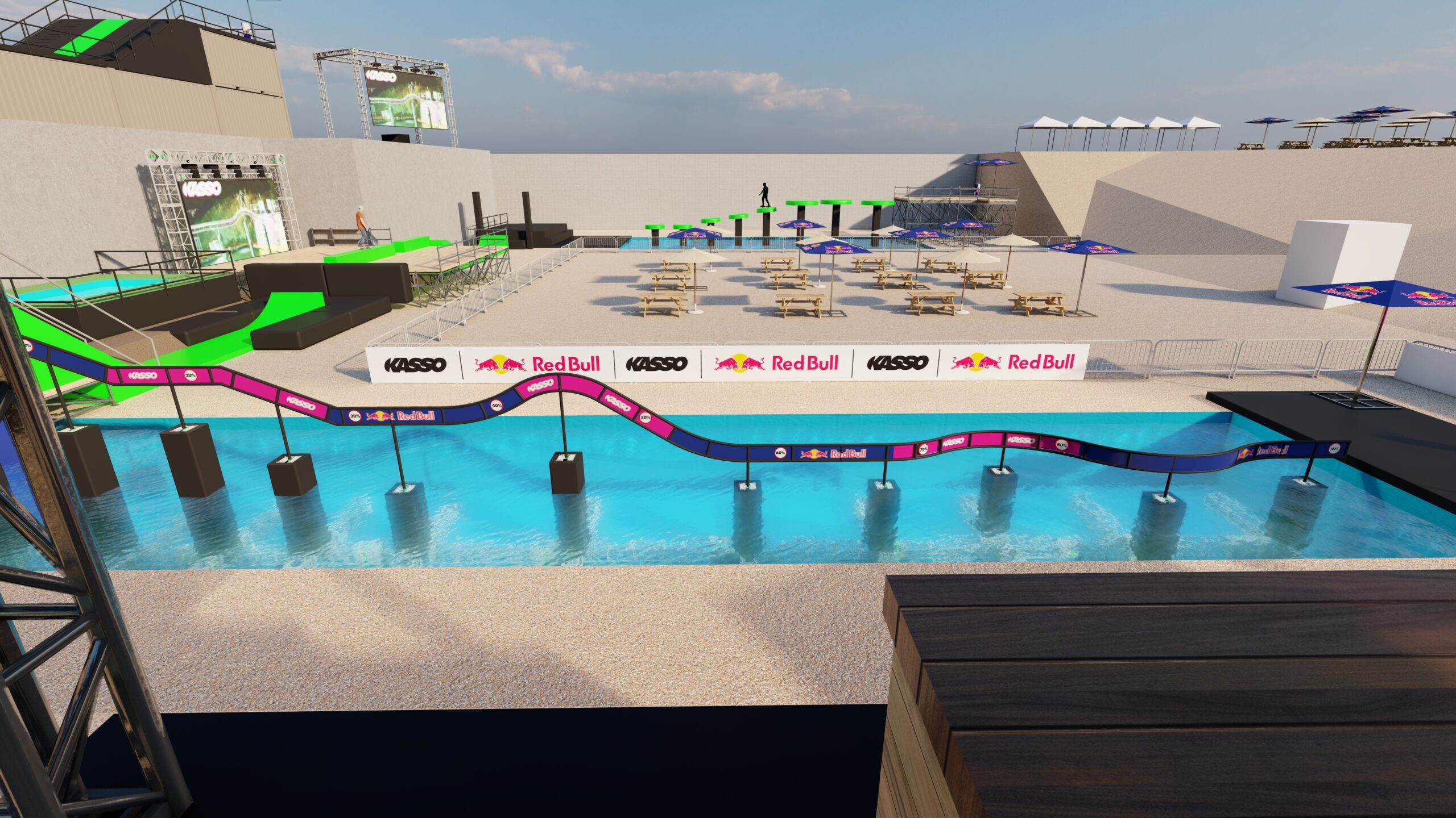 • Branding & Signage Exploration: Using our 3D Visualization Services, we rendered multiple branding options. This allowed Red Bull and Kasso organizers to review logo visibility, color contrasts, and “on-camera” feel within the virtual Long Beach venue.